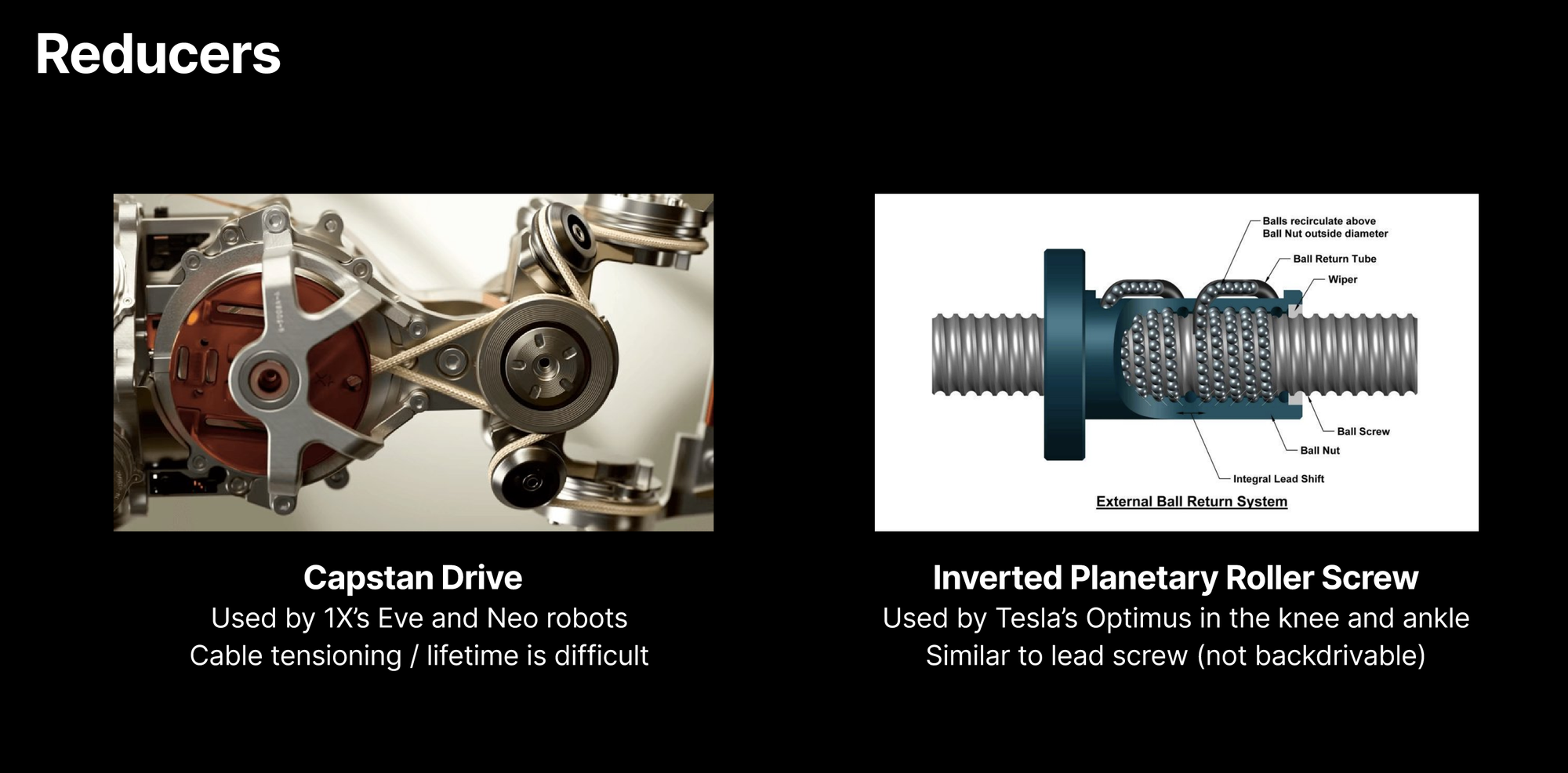 Reducers matter as much as motors. Harmonic gears dominate in China. Tesla chose an inverted planetary reducer—impressive for lifting heavy loads, but non-backdrivable, which made simulation-based training (the dominant approach in China) nearly impossible. This arguably set Tesla’s Optimus program back compared to competitors like Unitree.