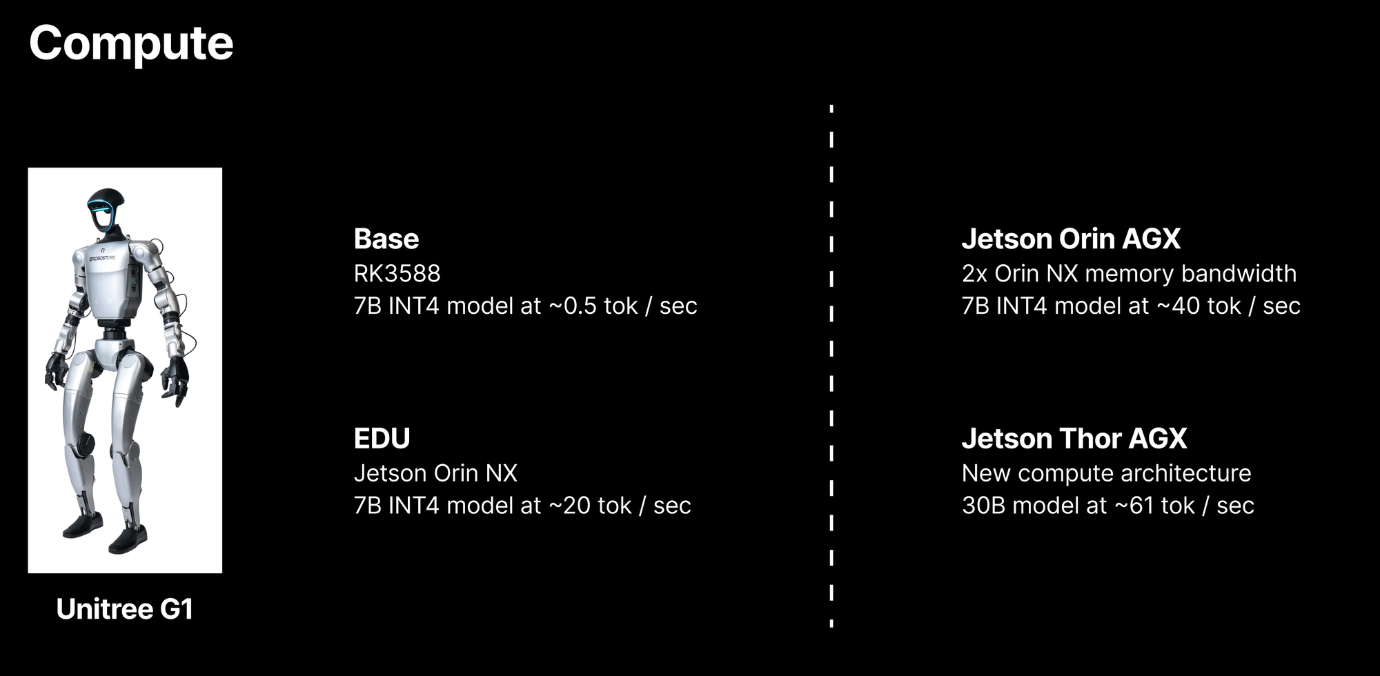 Humanoid robots will need to run 7B+ parameter models locally for real-time control. NVIDIA Jetson is the incumbent, but there’s a window for compute companies that can be price-competitive for on-device inference. Chinese companies like Unitree are already onshoring their chip supply chains, moving from Raspberry Pi to Rockchip. Any company selling inference chips at humanoid-friendly price points should be on investors’ radar.