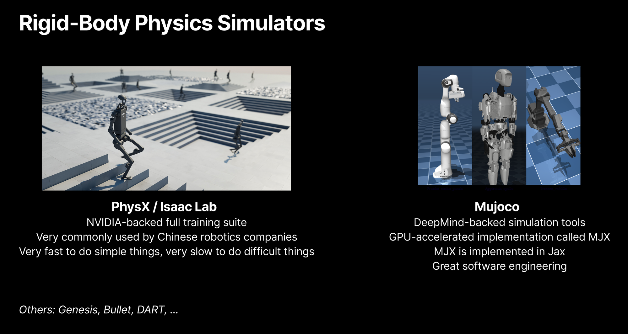 Boston Dynamics built beautiful robots with classical C++ control systems—they can do backflips but not much else general-purpose. Unitree, by contrast, put millions of simulated robots through reinforcement learning and achieved backflips on hardware that costs a hundredth of the price. And the crucial point: it’s not just backflips. Once you have the data and the paradigm, it’s everything—just like translation wasn’t just English-to-Spanish.